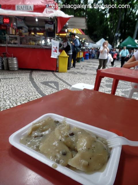 Também comi na Ukrainian Heritage Village,  com recheio de batata e estava ótimo. Eu sei, comida em bandeja de isopor fica muito feia mas pedimos diversos pratos e estavam todos ótimos. Se alguém tiver uma receita, por favor, me mande. Você vai ouvir também pirogue, pierog, perohê, pyrohy ou varenike. Geralmente é servido cozido, frito ou assado e recheado com ricota e batata. A origem é polonesa e ucraniana e foi difundida pelos imigrantes que vieram para cá.